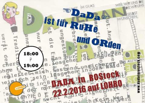 Es musste sein. 100 Jahre haben wir gebraucht, bis Dada Rostock erreicht hat. Als ob hier das Vernünftige auch immer das Gute war. Darum gehen wir los – in Begleitung der Weimarer Dadaisten im Umfeld von Radio Lotte und inspiriert von der Züricher Retrodadabewegung, die vor allem finanzstark ist. Aber Dada muss man erleben und ausleben – das wollen wir hier. Dranbleiben und mitmachen, mehr kann ich jetzt nicht sagen…